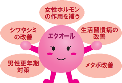 このエクオールは、大豆イソフラボンが腸内細菌の力で作られることから、「スーパーイソフラボン」などとも呼ばれていて、 女性ホルモン=エストロゲンと似た働きをするため、更年期障害、お肌のシワやシミ、骨粗しょう症、メタボ・生活習慣病改善などがあると言われています。